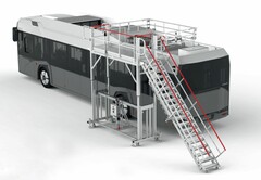 BU: Auf der LogiMAT in Stuttgart zu sehen: eine elektrisch höhenverstellbare Arbeitsbühne für Wartungsarbeiten. Das Modell mit Bus wurde von HYMER exakt auf die Anforderungen eines Kunden im Nutzfahrzeugbereich entwickelt und gefertigt.